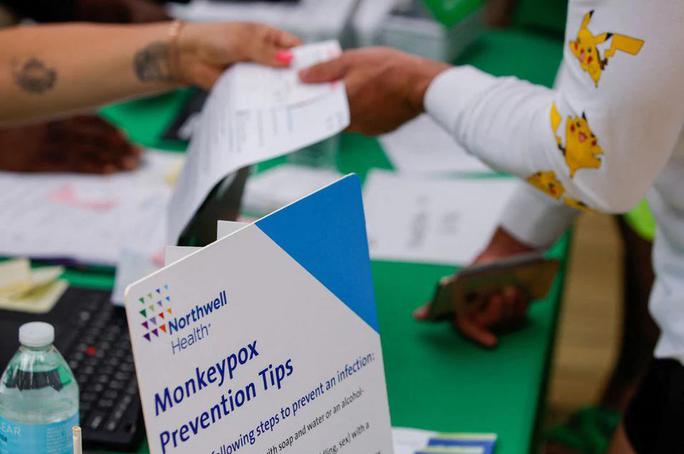 Một người có nguy cơ đang nhận hồ sơ để chuẩn bị tiêm vắc-xin ngừa đậu mùa khỉ - Ảnh: REUTERS